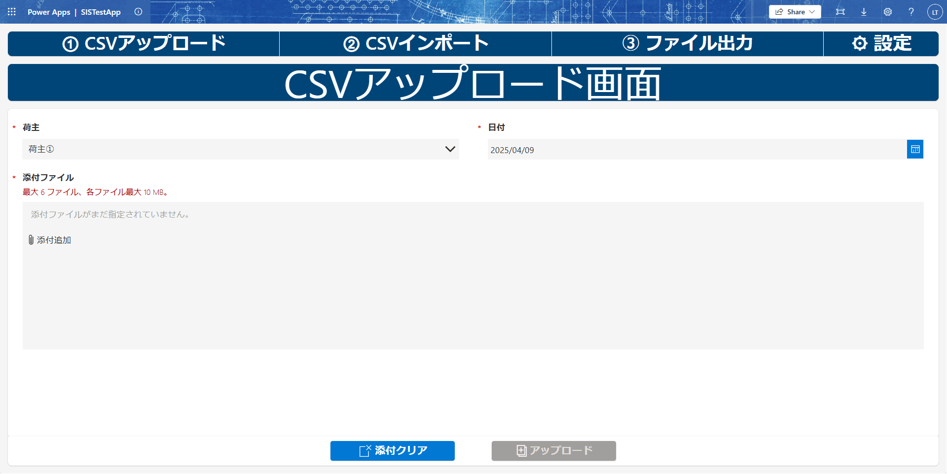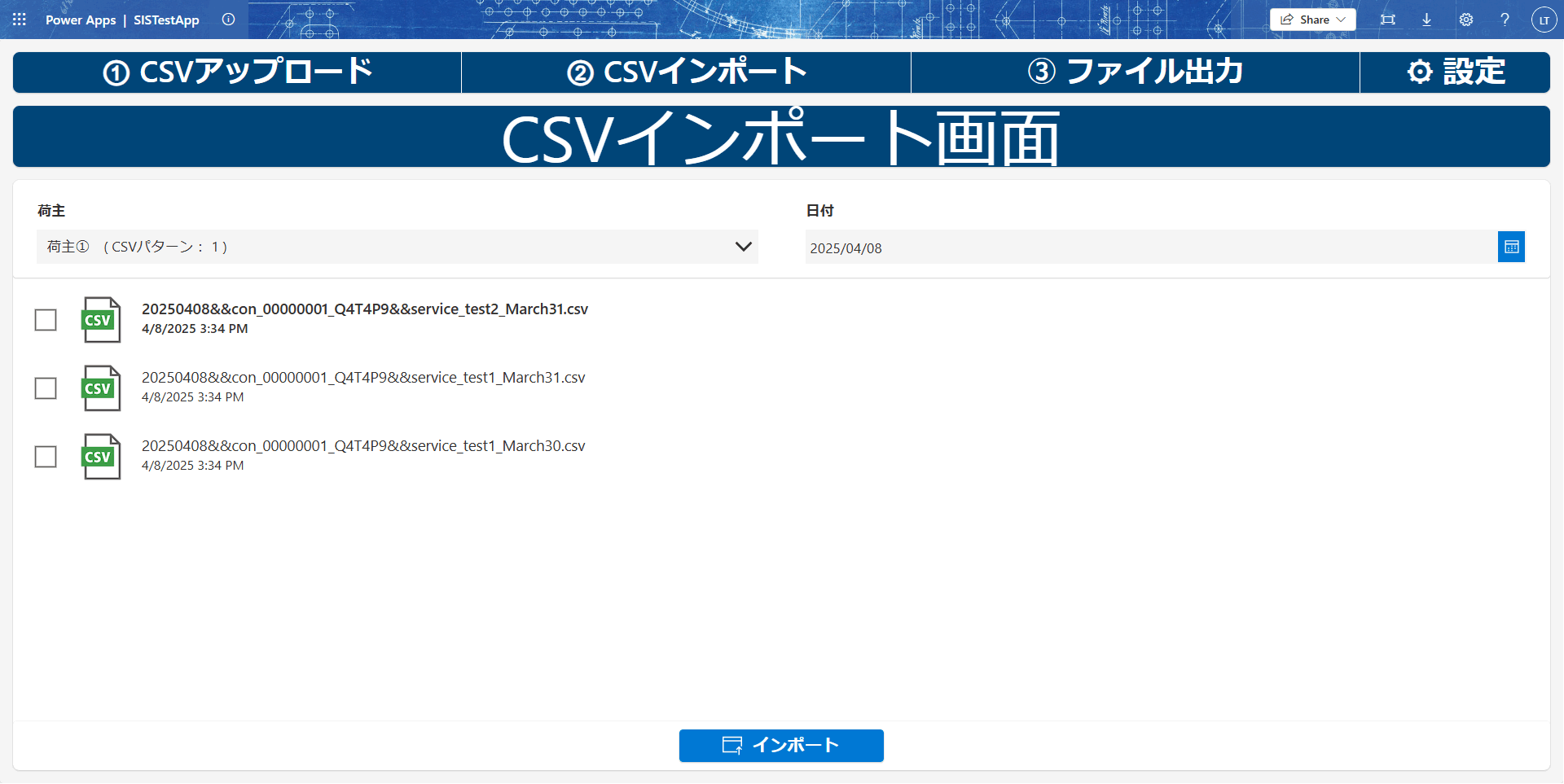 | 4 | インポート | クリックすると、ファイル一覧で選択したファイルのデータをアプリにインポートする。 また、インポート済みの重複ファイルはスキップされる。 なお、2種類の異なるCSVパターンに対応している。 インポート処理は別のPower Automateフローで実施される。 |