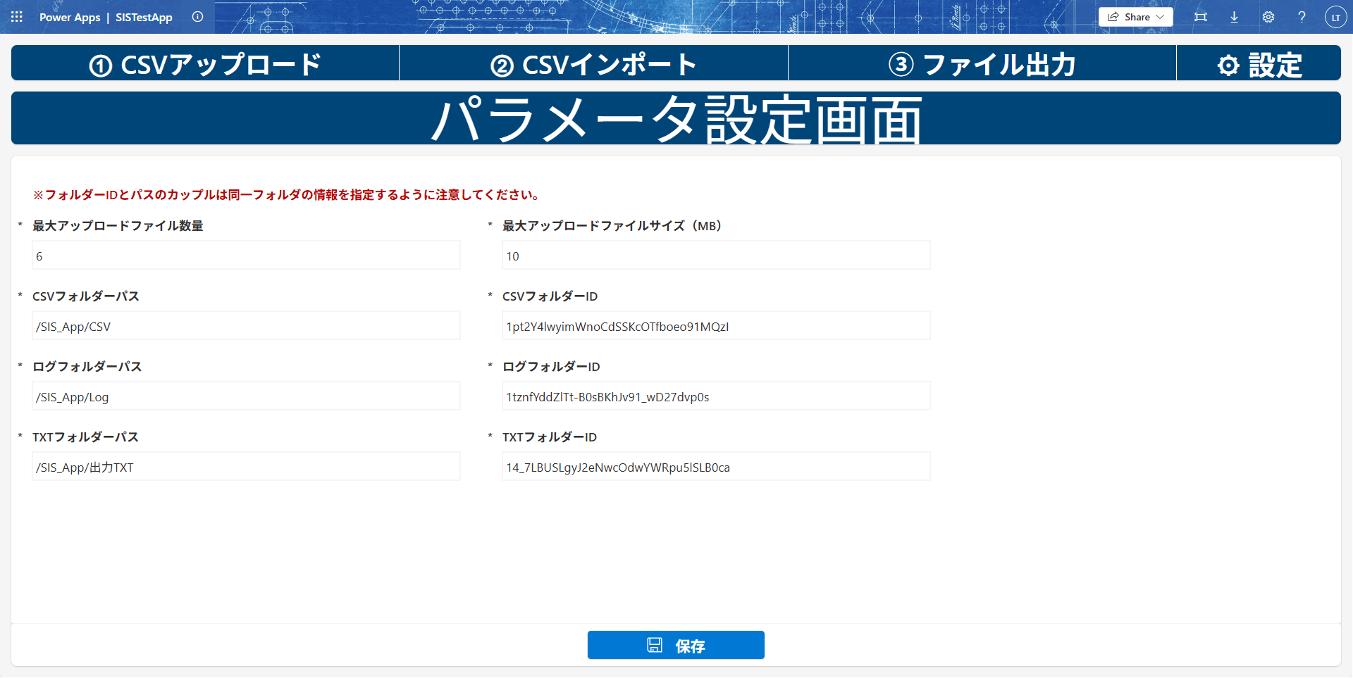 この画面では、CSVのフォルダパスなど、アプリのパラメータを設定できる。