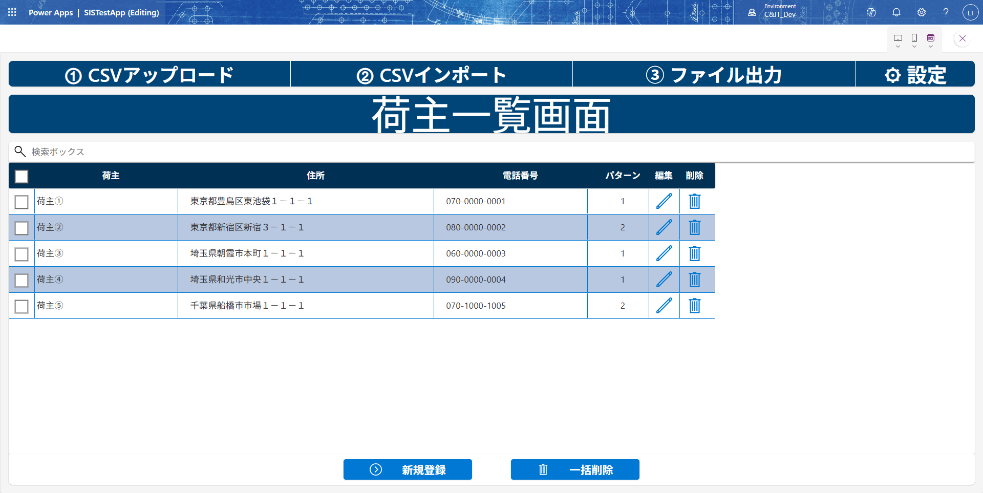 | 5 | 出力 | クリックすると、データ一覧で選択したレコードをファイル出力する。 出力処理は別のPower Automateフローで実施される。 (このサンプルアプリでは、出力されたファイルはグーグルドライブに保存されている。) |