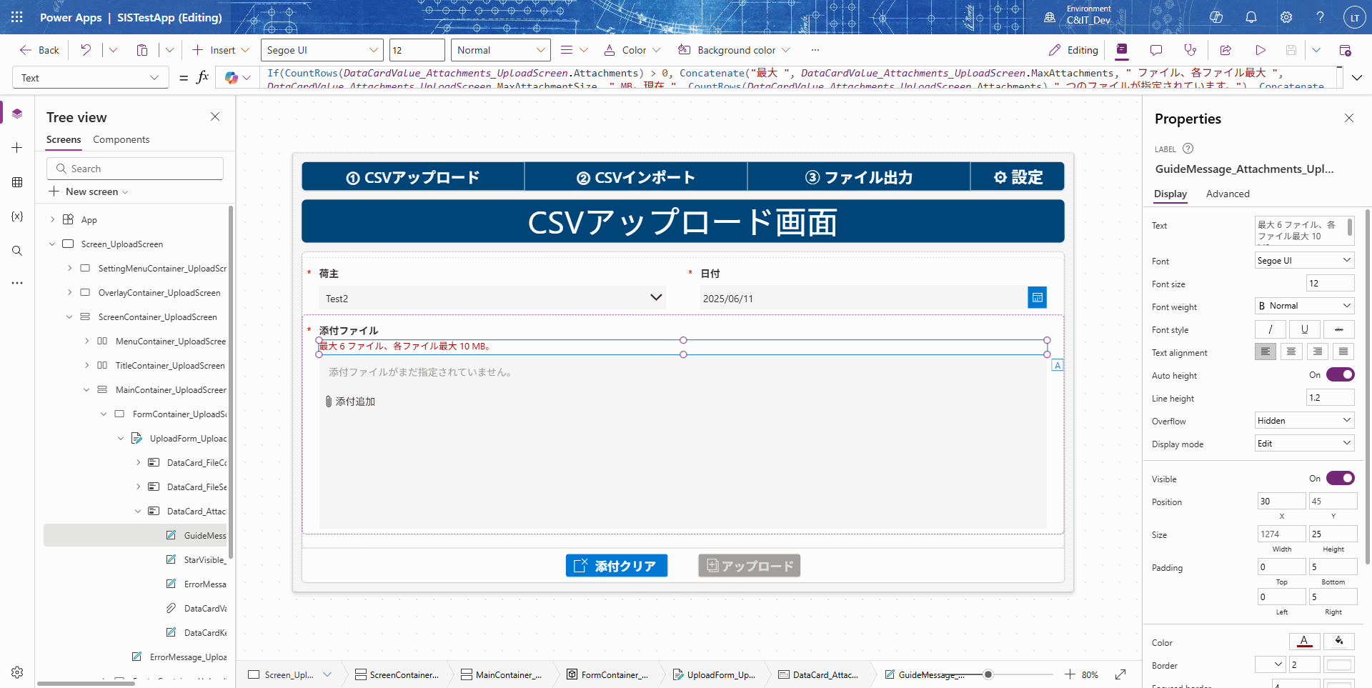 | 5 | アップロード | クリックすると、添付ファイルのリストに指定しているファイルをアプリからフォルダにアップロードする。 アップロード処理は別のPower Automateフローで実施される。 (このサンプルアプリでは、アップロードされたファイルはグーグルドライブに保存される。) |